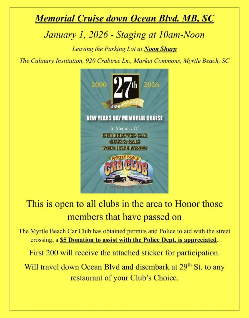 The MBCC has again been asked to participate in the Broadway at the Beach Christmas Parade. It will be held on Saturday, December 6, 2025, at 11:00 a.m. at Broadway at the Beach. Line up begins at 9:00 a.m. on December 6th and the parade starts promptly at 11:00. All parade entries can be decorated in a holiday theme, and you may pass out candy. Santa Claus will be in attendance so please, no Santa Claus costumes. I have asked that we have space for 16 cars. As of now I have not heard back on how many they will allow. I will take names on a first come, first serve basis on who responds to me at delcostello@sccoast.net to get your name on the list. I will keep names in reserve in case someone drops out. When I find out for sure how many cars they allow, I will send out a list of who is in the parade. This is always a fun time with a lot of people lining Broadway at the Beach.
