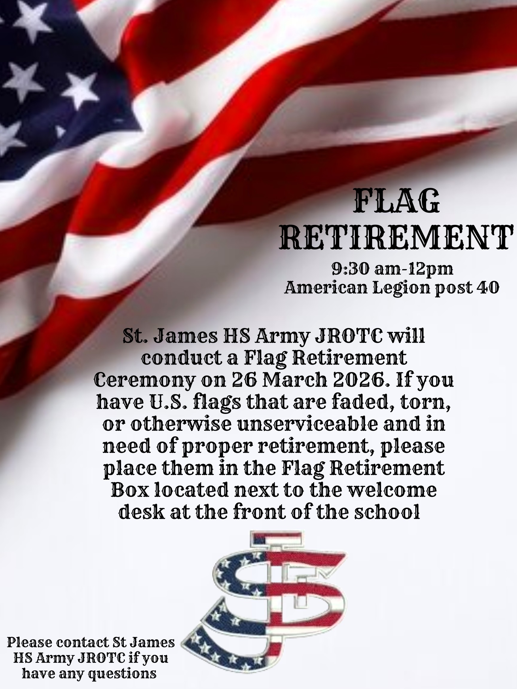 The ceremony is sponsored by the St. James High School Army JROTC, which was a nominated charity this year by Scott Bartley. If you have a US flag that is faded, torn or otherwise unserviceable and in need of proper retirement, please bring them to the St. James High School in Murrells Inlet. There is a Flag Retirement Box located next to the Welcome Desk at the front of the school. If there are any questions, please contact the St. James High School Army JROTC. Their web site is: www.sjhsarmyjrotc.com. Click flyer below for full size image.