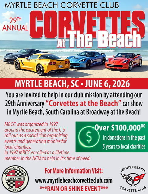 Thank you to all who attended the 28th Annual “Corvettes At The Beach” car show this year. Your paid registration, purchase of T-shirts, Friday Dinner tickets, 50/50 sales, “Tricky Trays”, raffles and more, you all helped the Myrtle Beach Corvette Club raise well over $28,000 for our charities this year alone, and over $240,000 in the past 10 years combined.