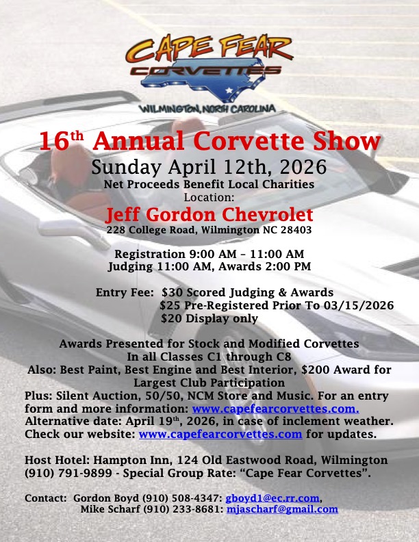 Cape Fear Corvette Club – Wilmington, NC – Jeff Gordon Chevrolet – April 12th, 2026 (Rain April 19th) – This show is a MAIL IN only for Pre-Registation. Please CLICK HERE for registration form.