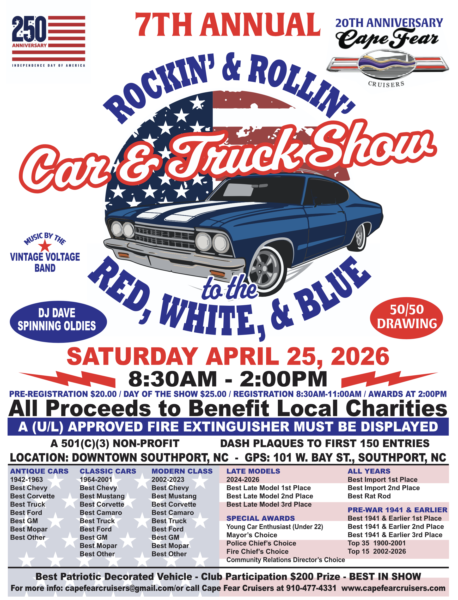 Cape Fear Corvette Club – Wilmington, NC – Jeff Gordon Chevrolet – April 12th, 2026 (Rain April 19th) – Online and Mail-In registration now available. CLICK HERE to Register now. $200 cash prize to the club with the most cars.