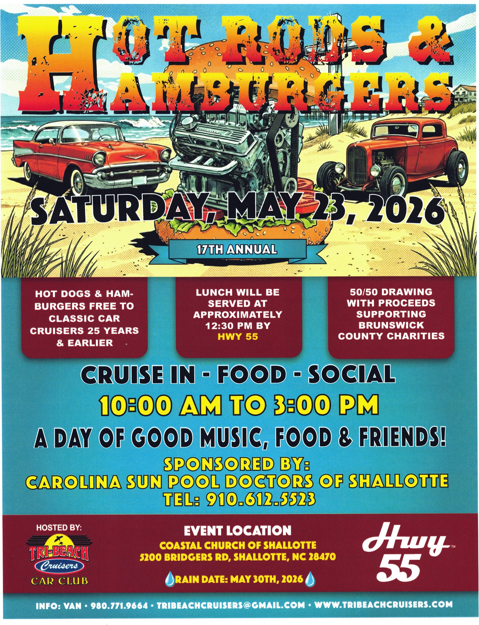 Hot Rods and Hamburgers – Coastal Church of Shallotte, Shallotte, NC – Saturday May 23, 2026 – 10:00 am – 3:00 pm