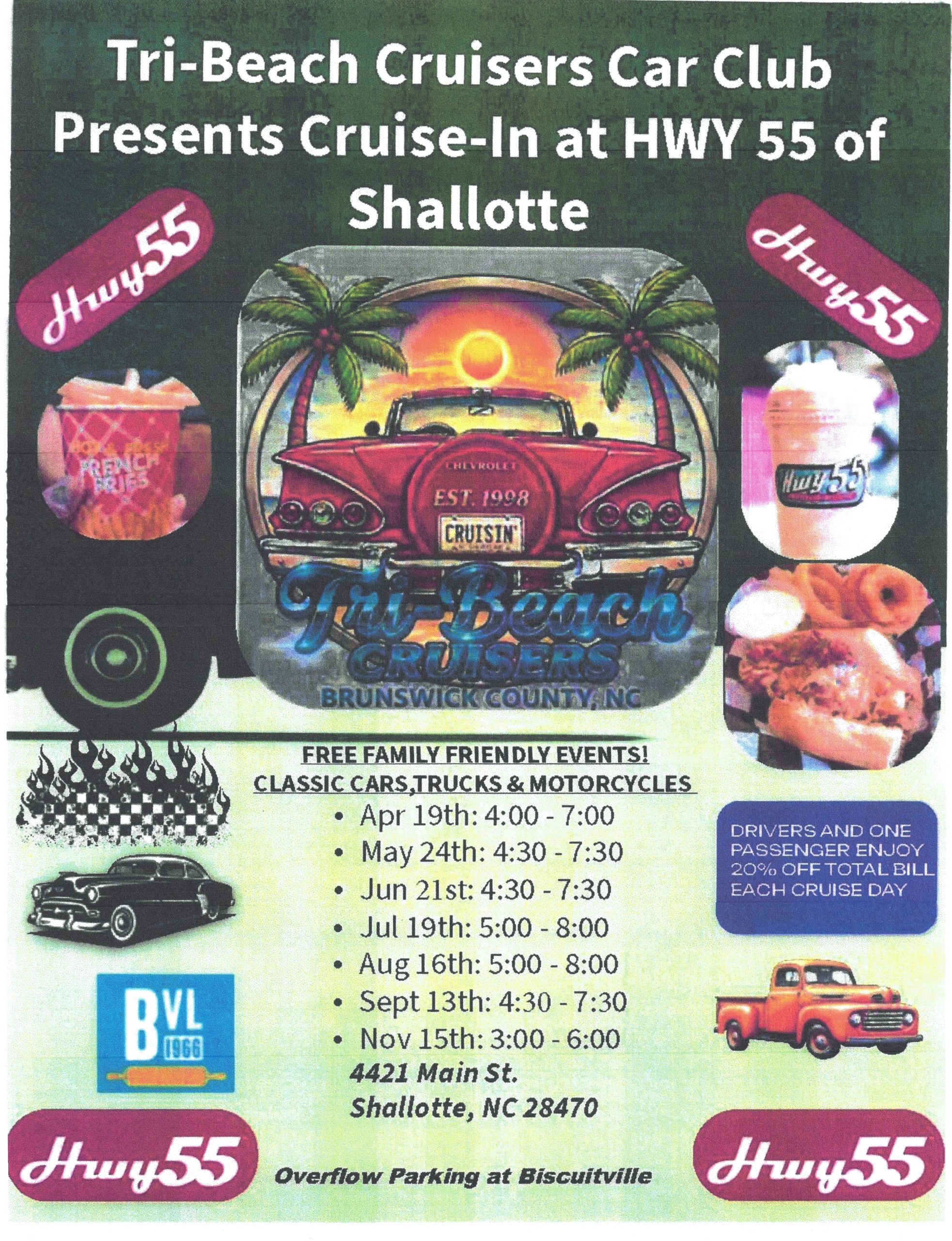 Tri-Beach Cruisers – Sunday Cruise-In at HWY 55 – 4421 N Main St, Shallotte, NC – Includes 20% food and drink orders for driver and one passenger