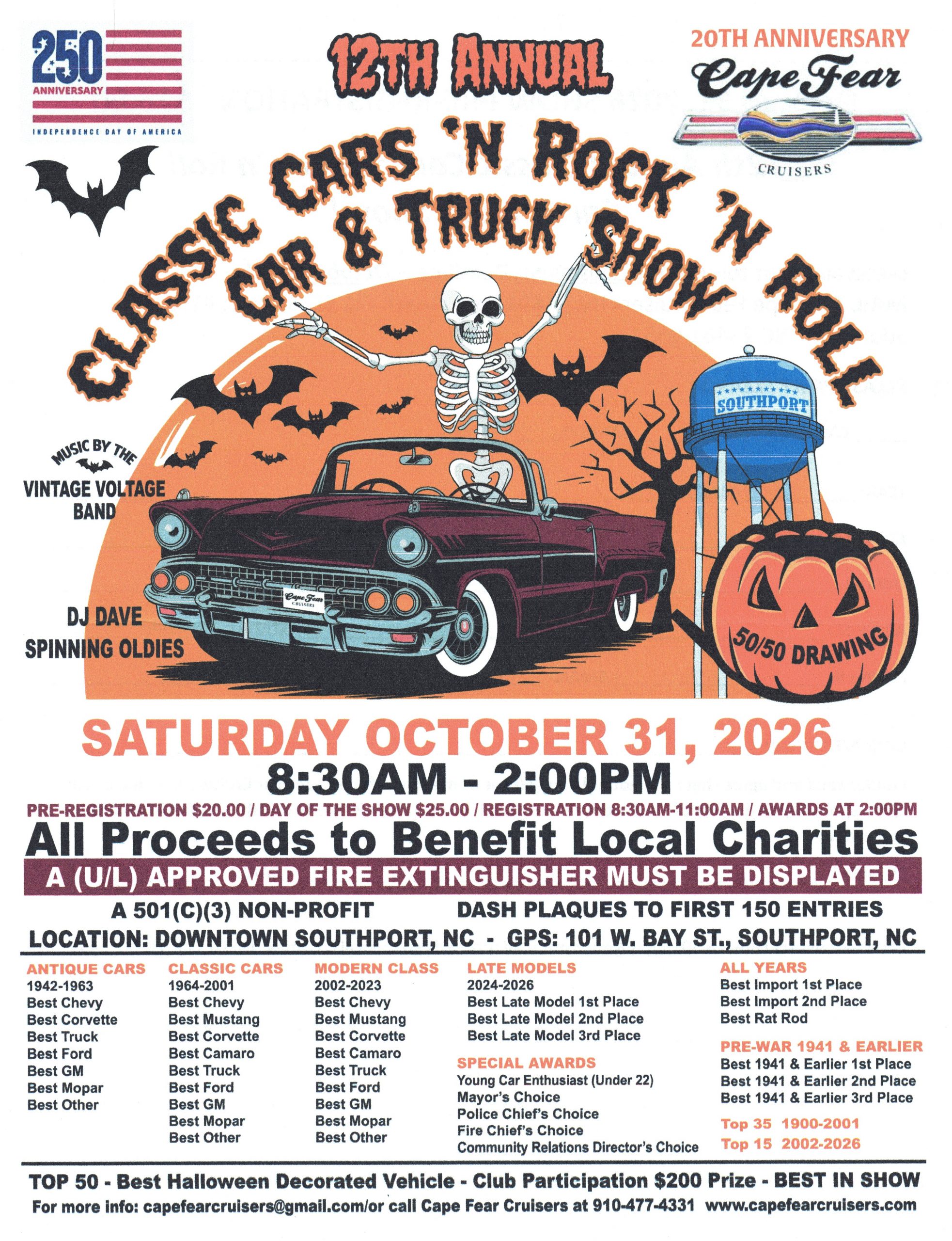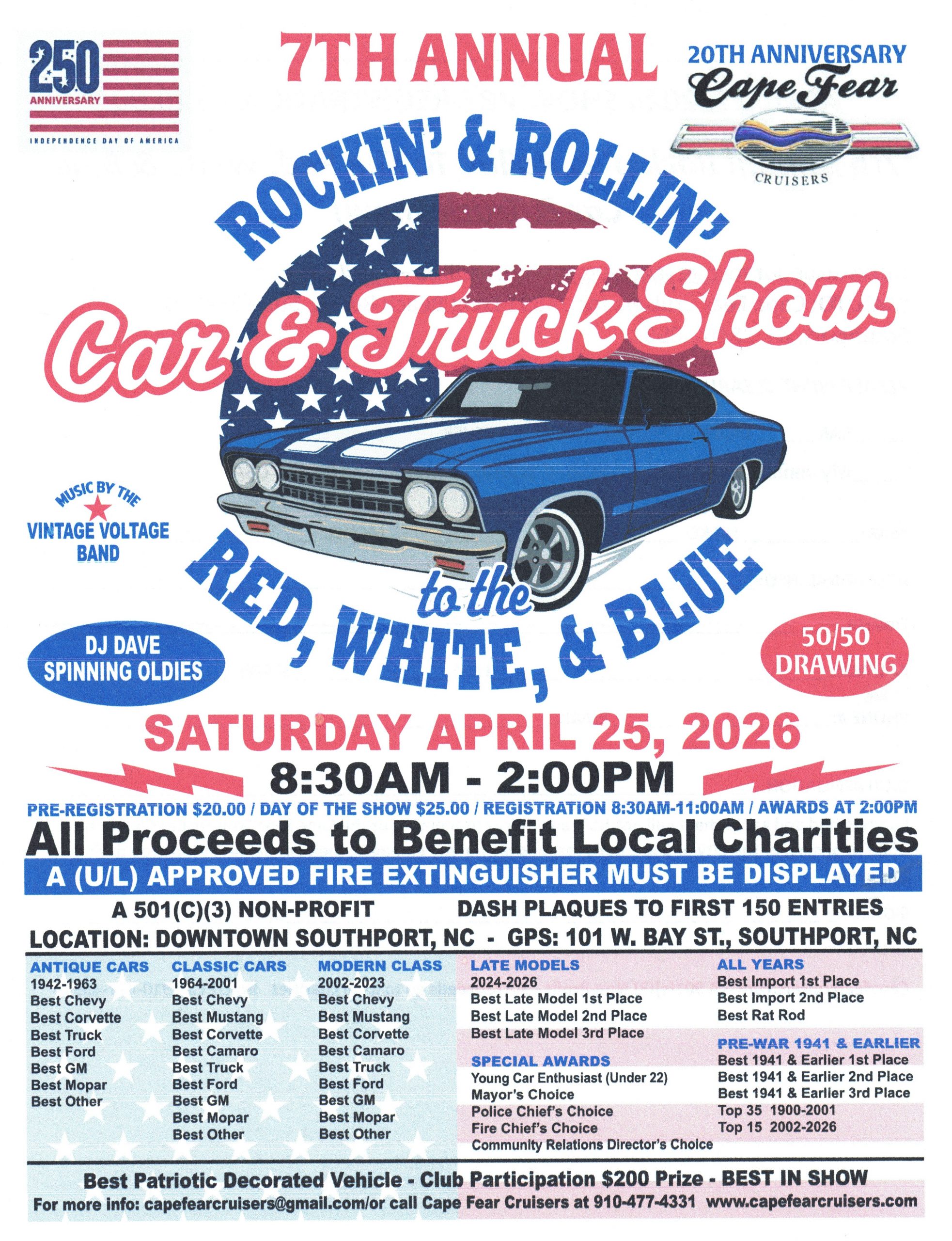 Cape Fear Cruisers – Rockin and Rollin to the Red White and Blue Car Show – Southport, NC Waterfront –April 25th, 2026 – 8:30 am – 2:00 pm